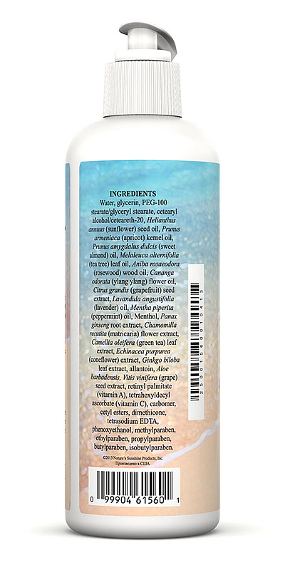 Деионизированная вода, глицерин, полиэтиленгликоль-100 стеарат, глицериловый стеарат, цетеариловый спирт, цетеарат-20, масло подсолнечника, цетиловые эфиры, диметикон, масло зерен абрикоса, масло сладкого миндаля, масло чайного дерева, масло дальбергии (розового дерева), масло иланг-иланг, масло мяты перечной, ментол, экстракт американского женьшеня, грейпфрута, лаванды, ромашки, зеленого чая, эхинацеи пурпурной, гинкго билоба, аллантоин, концентрат алоэ вера, экстракт из косточек винограда, тетрагексилдецил аскорбат (витамин С), ретинол пальмитат, гидроксид натрия, феноксиэтанол, метилпарабен, этилпарабен, пропилпарабен, бутилпарабен, карбомер, тринатрий ЭДТК.