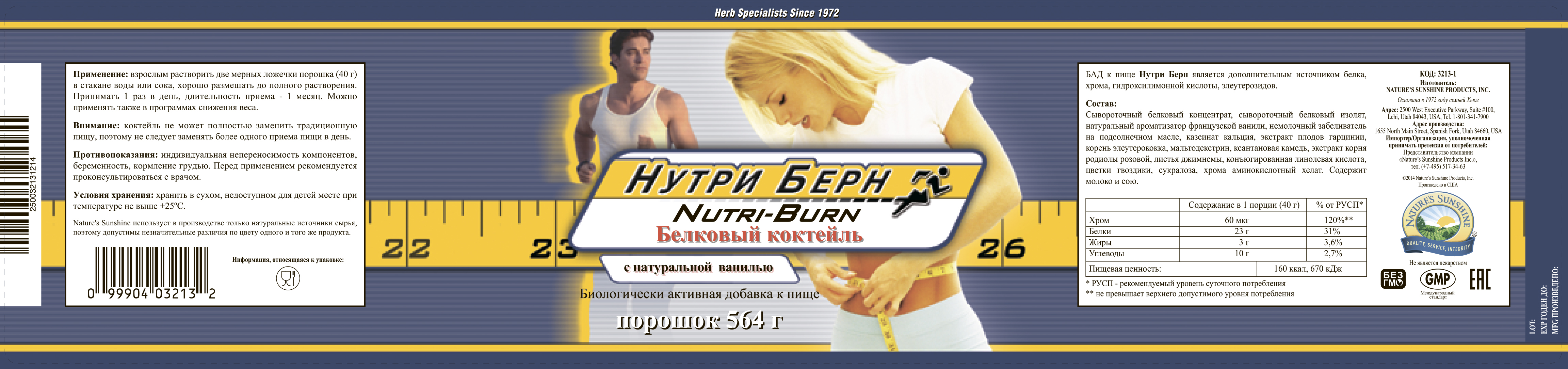 Нутри Берн включает смесь концентрата и изолята белков молочной сыворотки, которые по содержанию незаменимых аминокислот приближаются к идеальному белку и легко усваиваются в ЖКТ. Коктейль Нутри Берн представляет собой приятный на вкус низкокалорийный напиток, каждая порция (20 г) которого содержит 12,3 г белка, что составляет 17,6% средней суточной потребности взрослого человека в белке. В состав продукта также входит комплекс трав, способствующих снижению веса: гарциния, джимнема, родиола розовая, элеутерококк, а хелатная форма хрома обеспечивает утилизацию глюкозы и способствует накоплению гликогена.