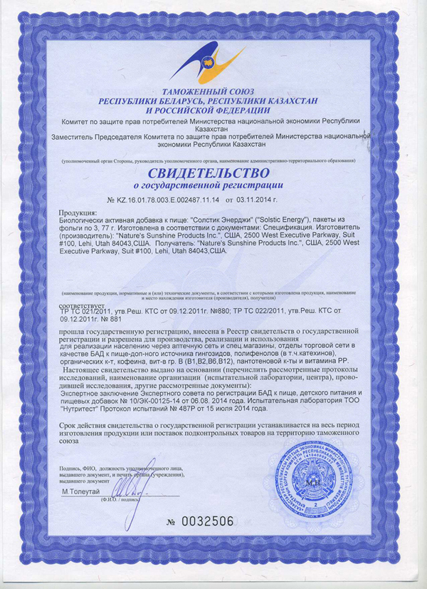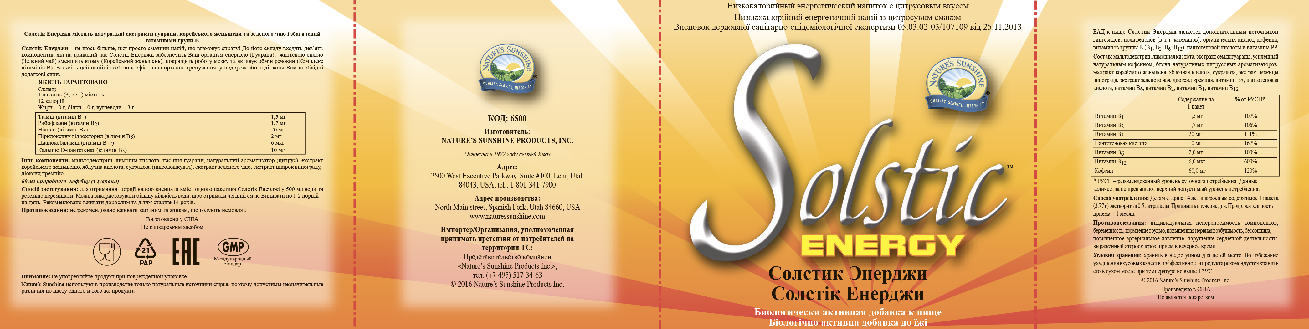 БАД к пище Солстик Энерджи является дополнительным источником гингозидов, полифенолов (в т.ч. катехинов), органических кислот, кофеина, витаминов группы В (В1, В2, В6, В12), пантотеновой кислоты и витамина РР.